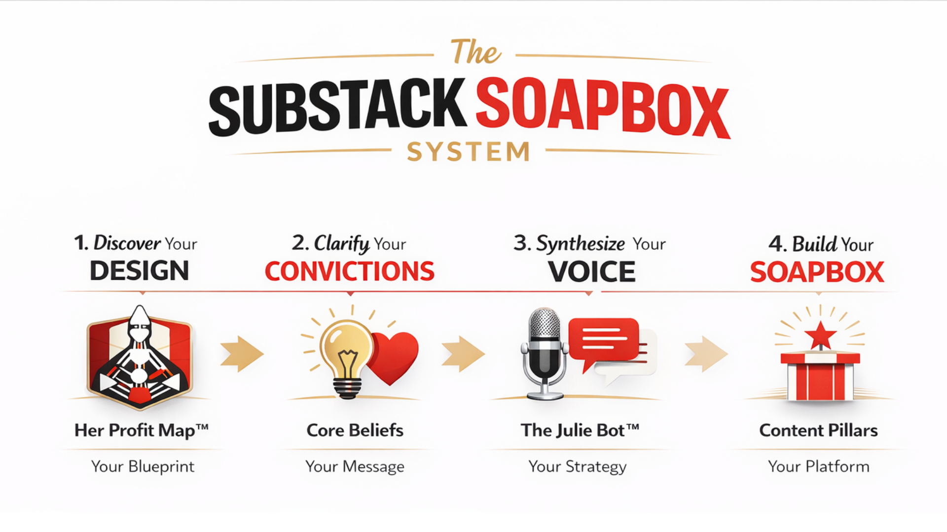 In this membership, you will create your Substack Soapbox — a thought leadership content matrix built from your Human Design & your deep convictions that attracts the right audience, amplifies your voice, and positions you to be seen, heard, and paid for your ideas.
